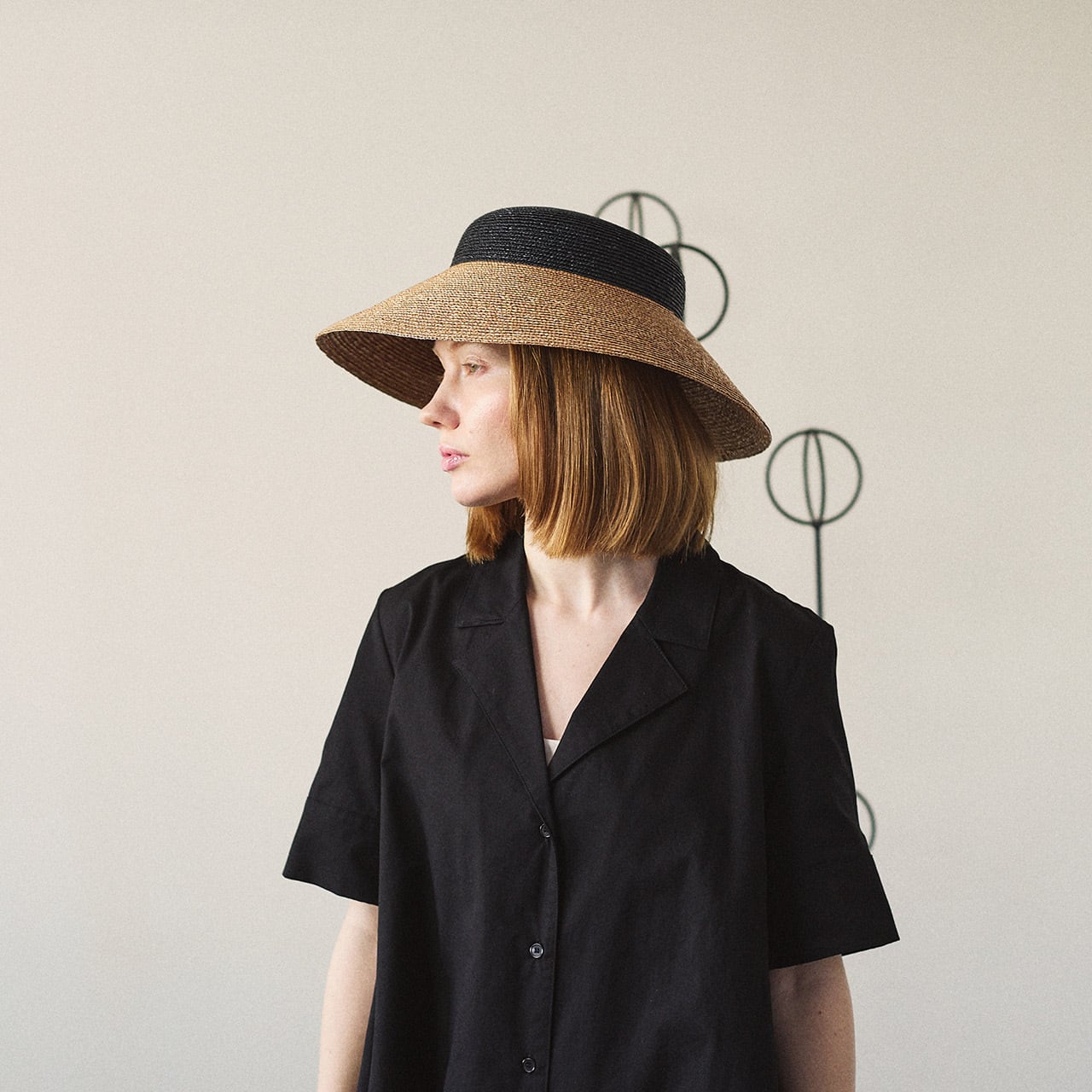 クラッシックなシルエットの浅型のキャペリンハットです。 ブレードをミシンで縫っていき、一点一点手加減でシルエットを形作っています。 浅いシルエットですが、内側に枠が入っているため、安定してかぶることができます。 材料となっている麦は手作業でしか製作できないため、近年大変希少になってきています。 ※手作業の為、個体差があります。 素材:本体 植物繊維(麦) 頭周り:約58cm (サイズ調整機能付き-2cm程度調整可能) ブリム長さ 13cm 01ナチュラルxブラック 02ブラックxベージュ