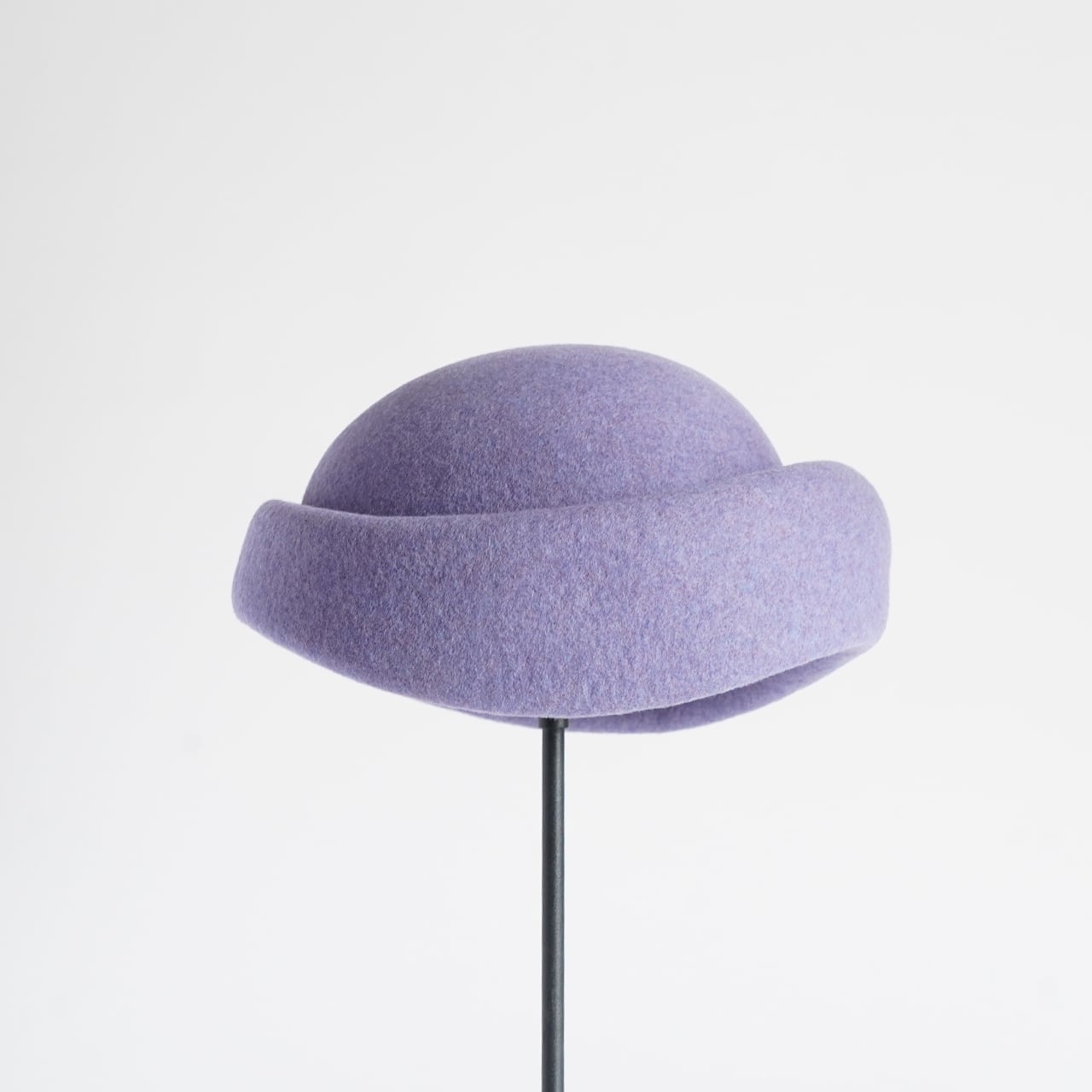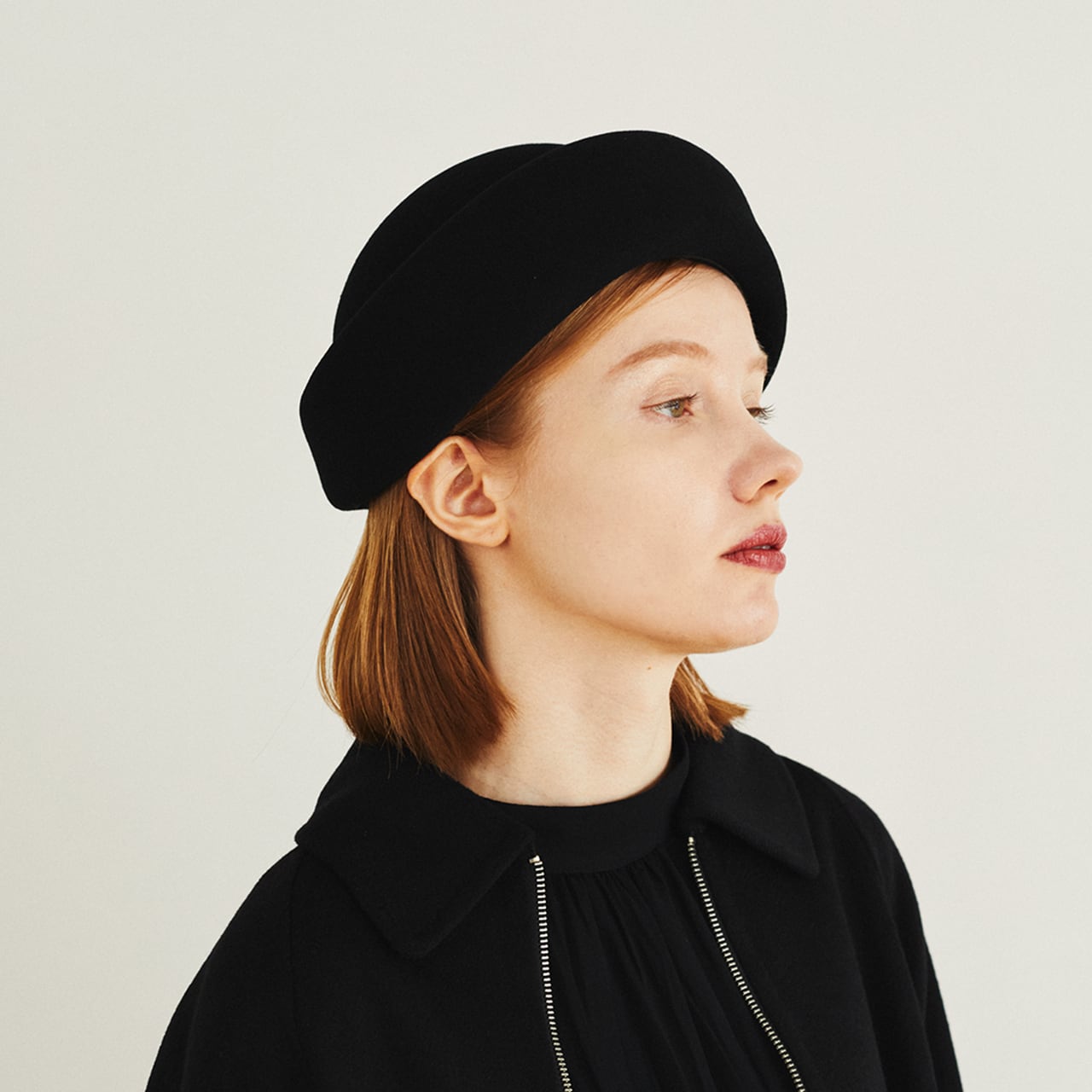 いわゆるトーク帽のシルエットですが、前後が上がってサイドが下がっている絶妙なアールから、色気を感じます。