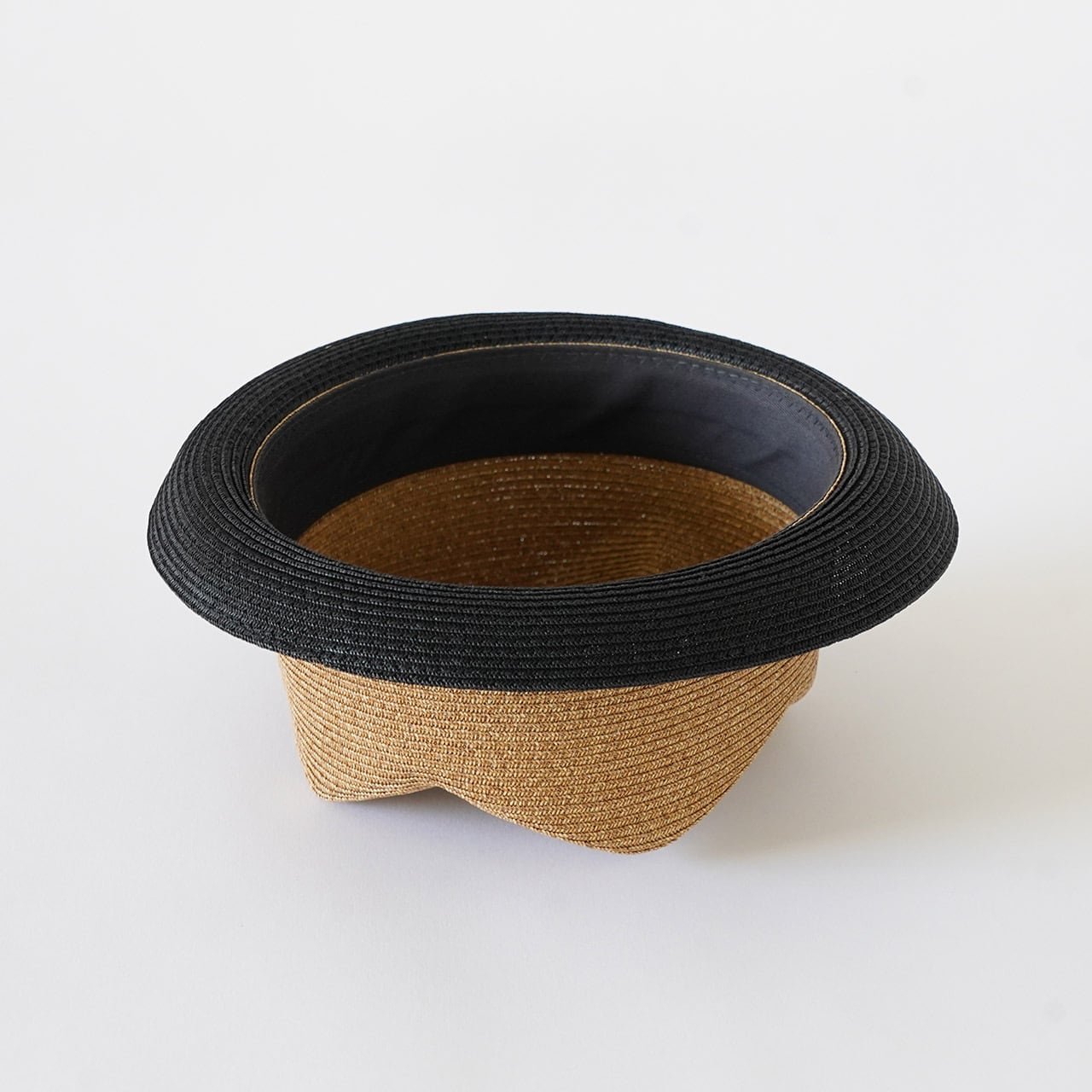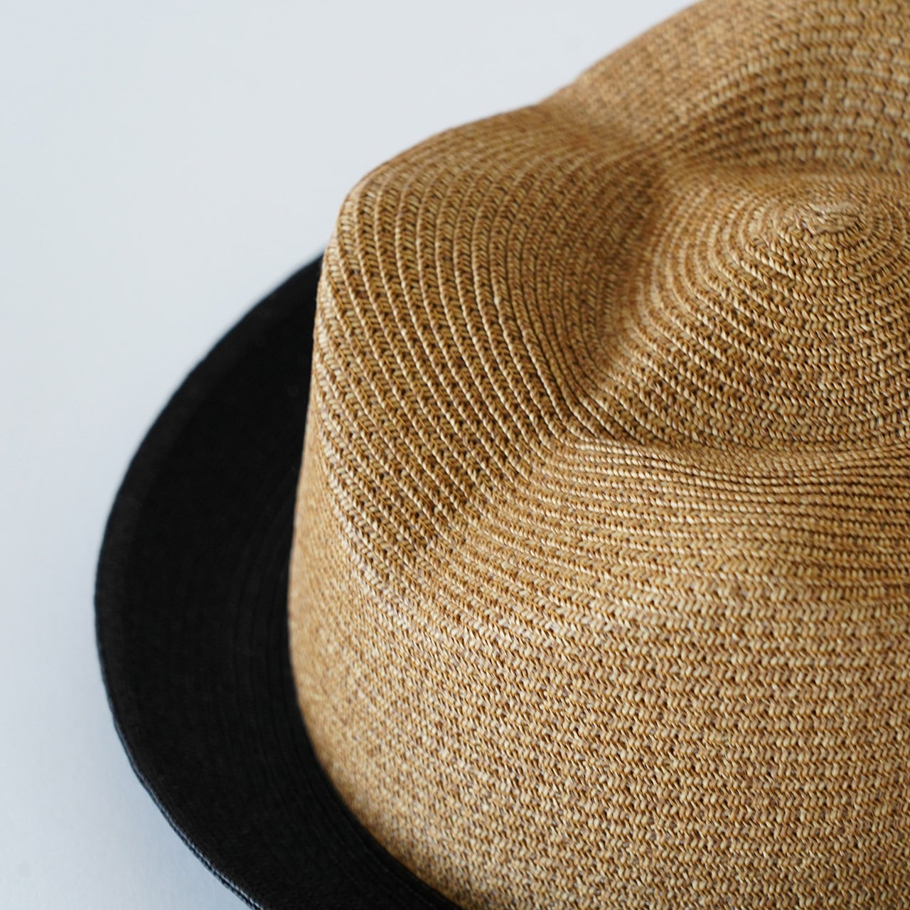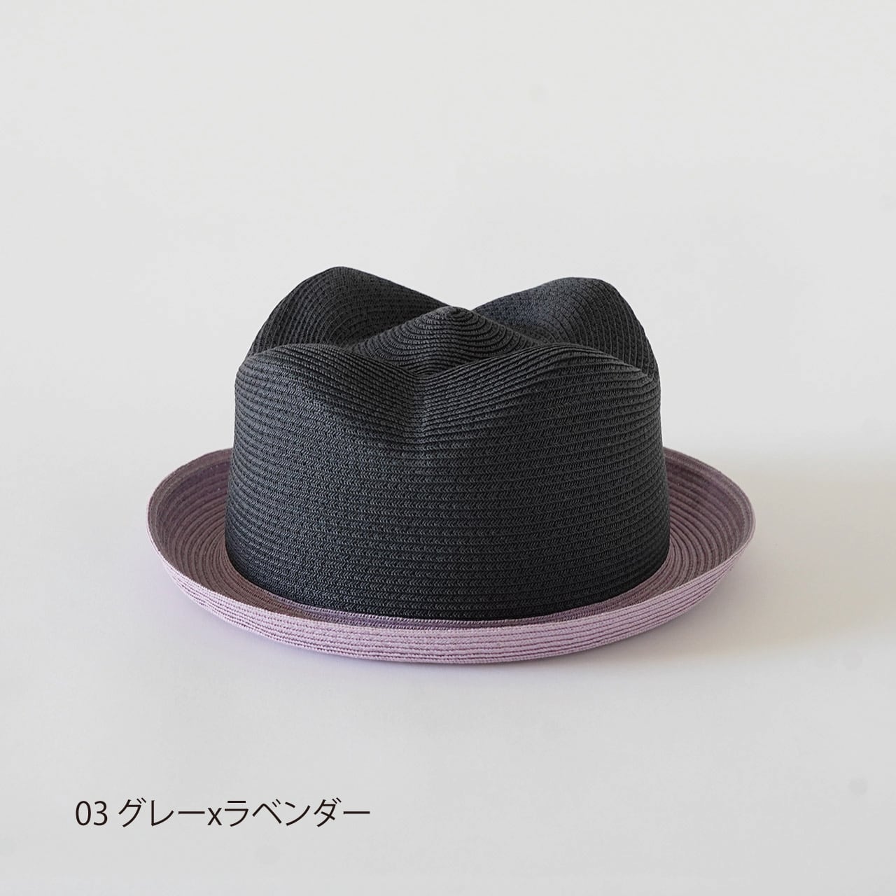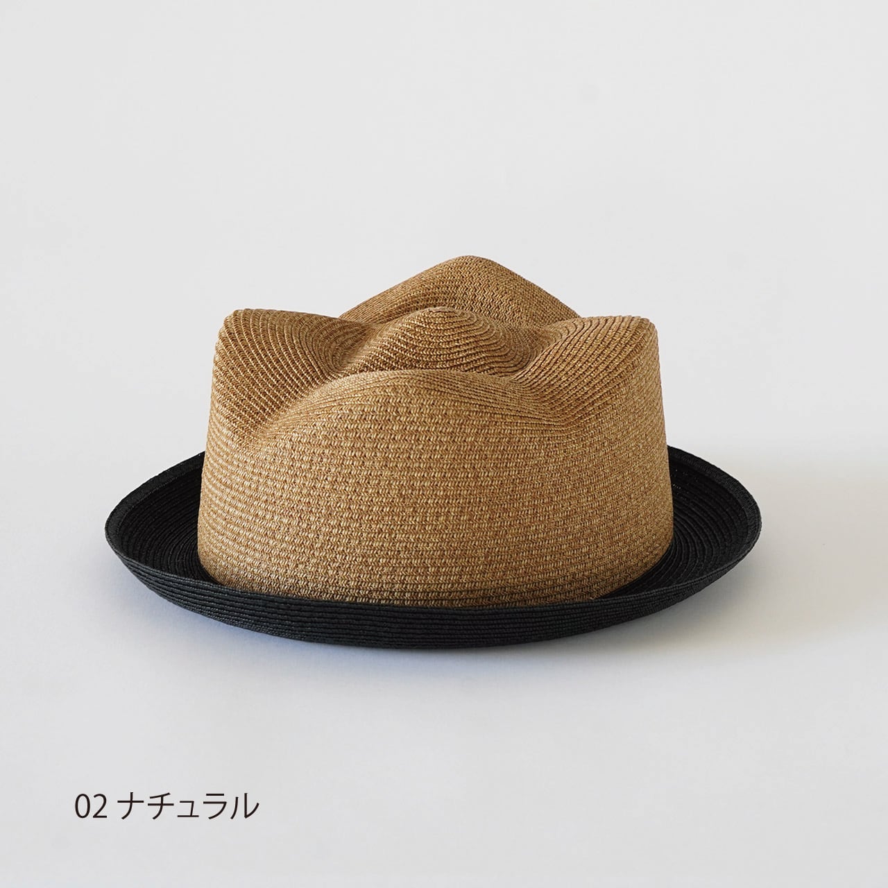 オリジナルの木型で制作したキングハット。 王冠をイメージした形が特徴的です。 個性的なデザインですが、ブリム とクラウンのバランスを何度も修正し、かぶりやすいデザインに仕上げています。 素材:分類外繊維(紙)90%ポリエステル10% 高さ:11㎝ ツバ長さ:4㎝ 頭周り:約58cm (サイズ調整機能付き-2cm程度調整可能) COLOR : 01 ブラック 02 ナチュラル 03 グレーxラベンダー